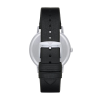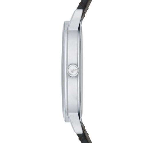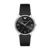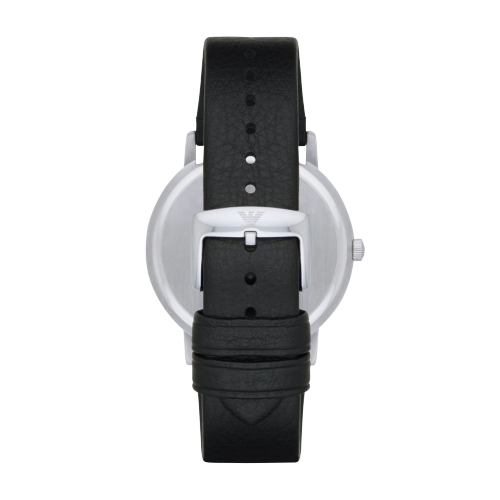 Sleek and refined, this men’s Emporio Armani watch gleams with a black sunray dial, stainless-steel case, and matte black leather band.